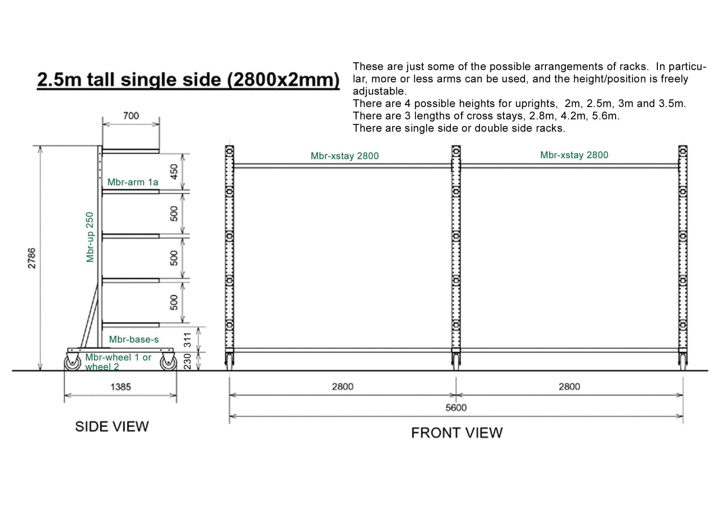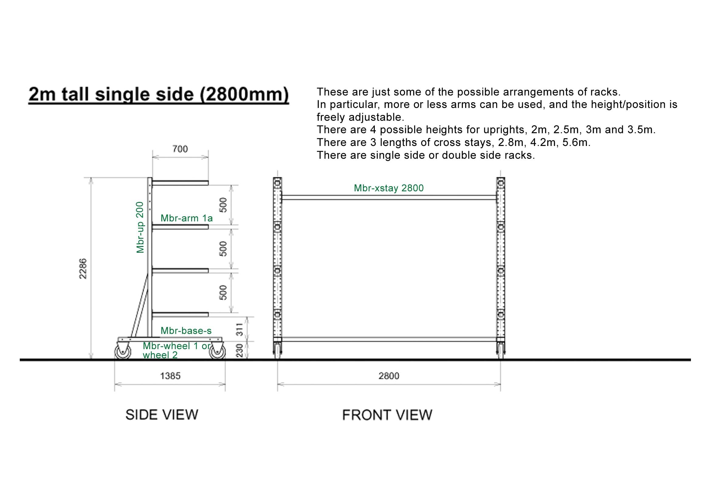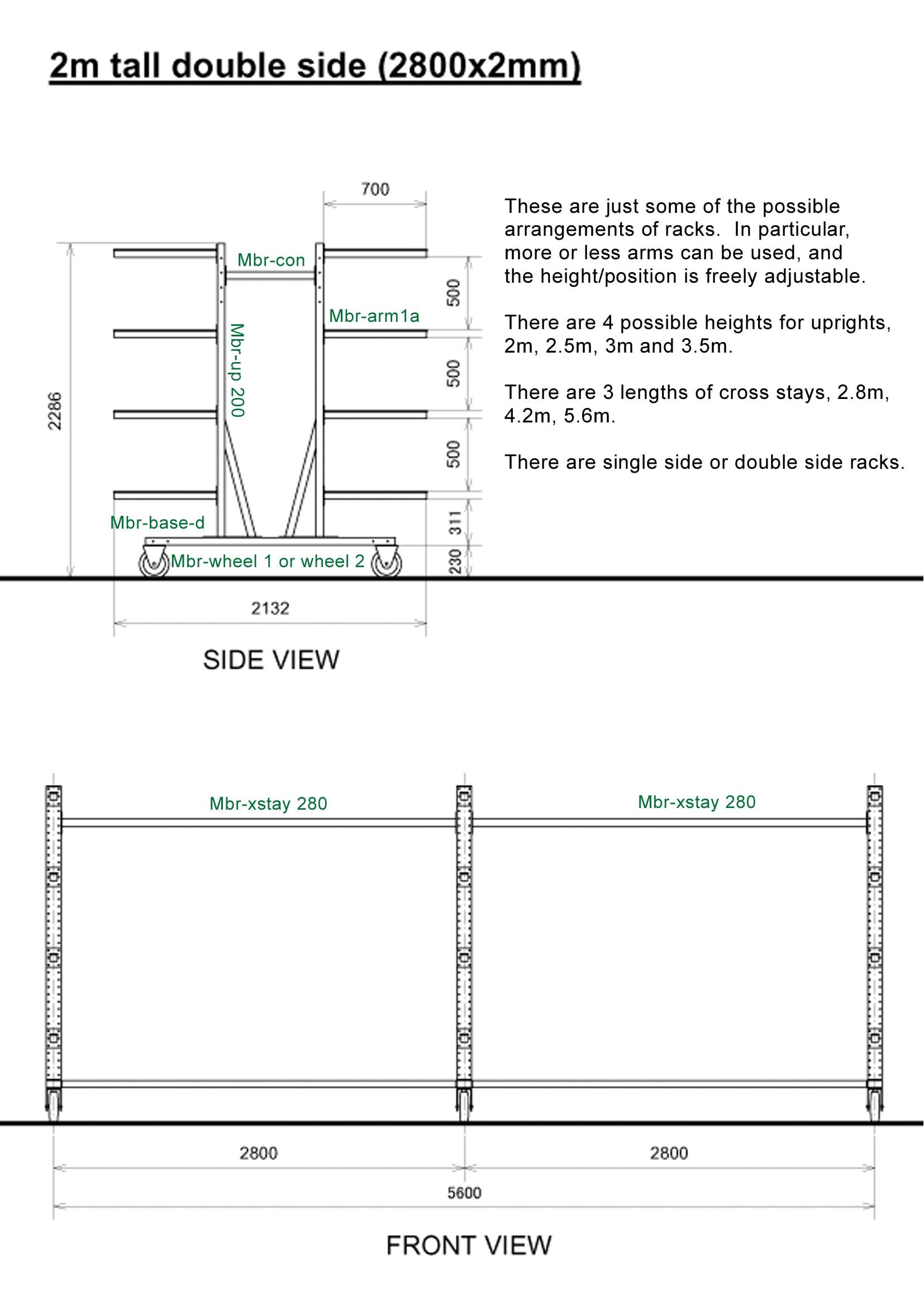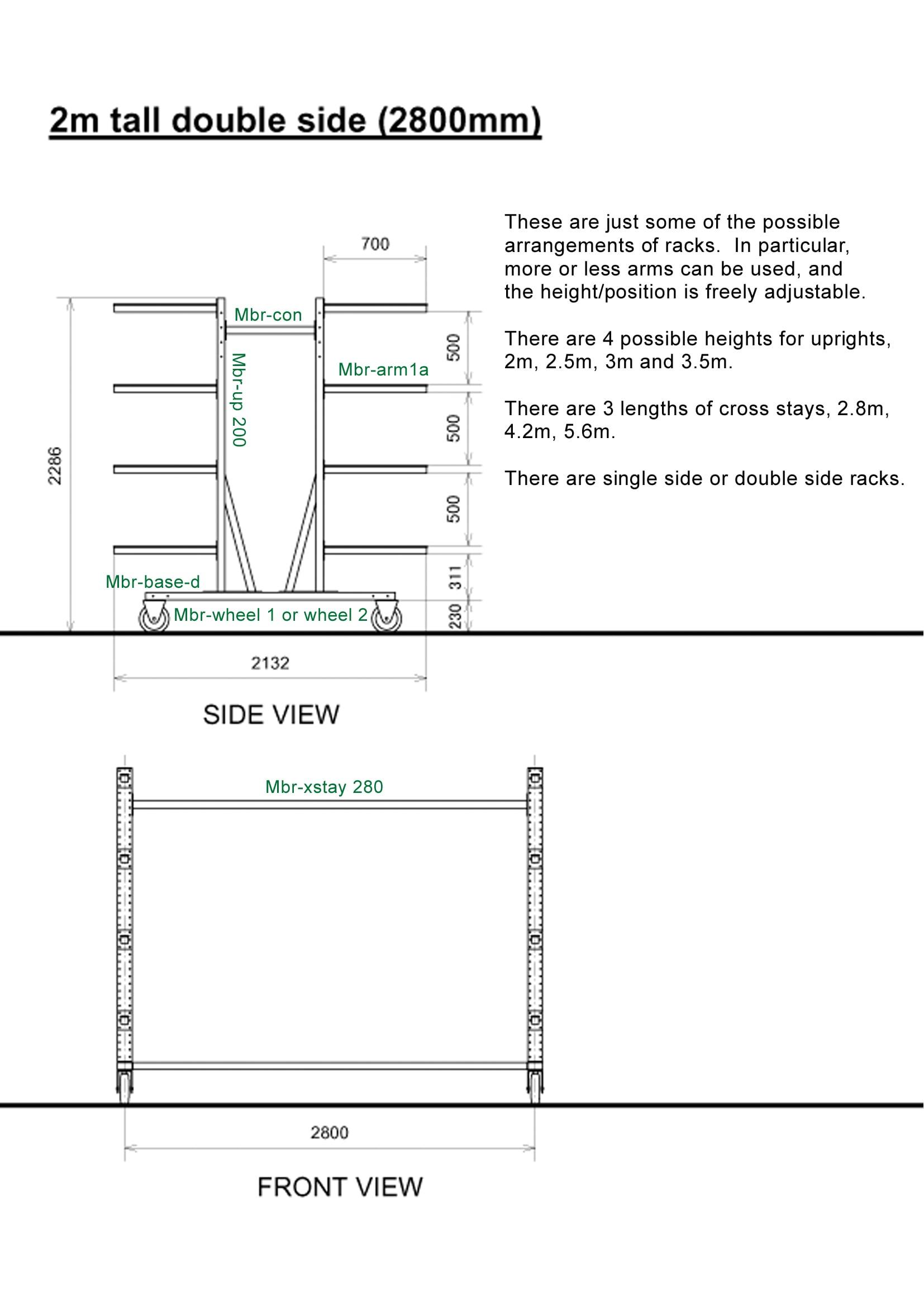 - Singles (1x) and Doubles (2x/2-) the standard rack is 2.0 m high, 2.8 m wide, and fitted with 2 × 5 arms of 70 cm. (Single-sided or double-sided)